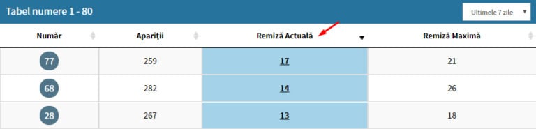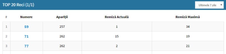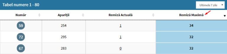 - „Remiza maximă 34" înseamnă că, în acest interval de 7 zile, numărul 59 nu a avut niciodată o pauză (o serie de extrageri consecutive fără apariție) mai lungă de 34 de extrageri.